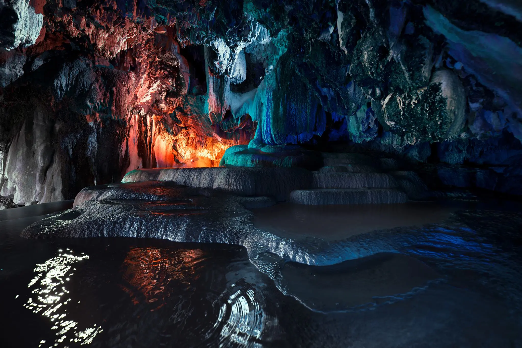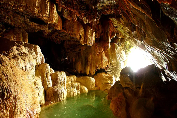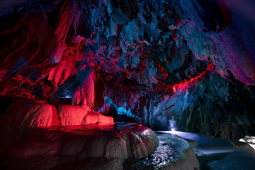 If you plan to visit, it is a perfect spot for adventure seekers. Unlike typical tourist stops, you can climb down into the canyon to find natural hot springs and emerald-colored pools where the water stays warm all year round. Under the bridge, the rocks are covered in colorful mineral hanging stones in shades of pink, yellow, and green.